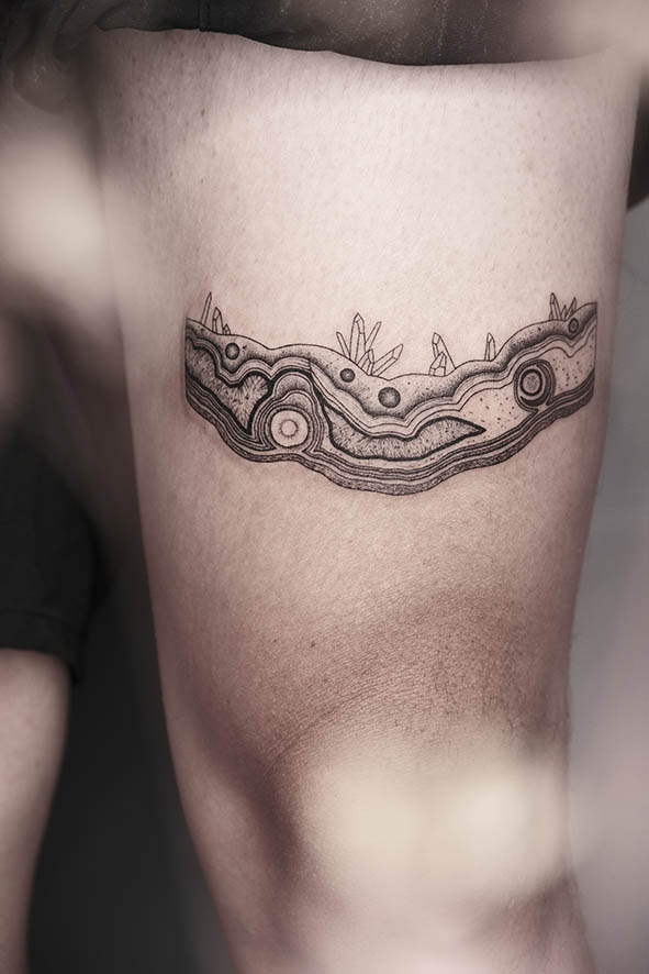 瑪瑙形成通常會被沈積礦物所包覆,而內部經由各種作用和沈積堆疊出千萬樣貌與色彩,許多還帶有佈滿晶簇的空洞,在能量上屬於較溫和的品質,能帶來安穩,著於釋放使人平靜。