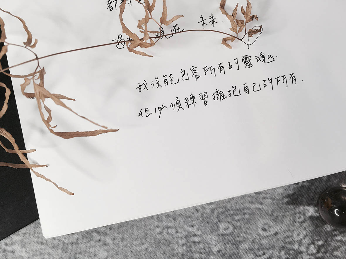 揮別一部份黑暗的自己,它們依舊是造就出我的碎片,疼痛是因為要前往更美好的理想,與之並存相習也相惜,希望這些屬於我的經歷慢慢將自己淬煉成更好的存在,期許在發光的時候也能將光芒灑落在某處。